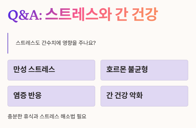 - 만성적인 스트레스는 우리 몸의 호르몬 균형을 깨뜨리고 염증 반응을 일으켜 간 건강에 좋지 않은 영향을 미칠 수 있습니다.