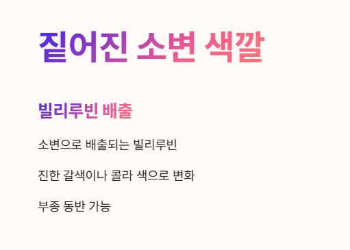 - 황달의 원인이었던 '빌리루빈'이 소변으로 배출되면서 소변 색이 진한 갈색이나 콜라 색처럼 변할 수 있어요.