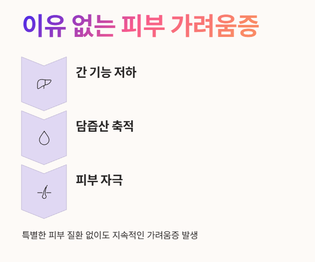- 간 기능 저하로 담즙이 원활하게 배출되지 못하고 혈액 속에 쌓이면, 담즙산이라는 물질이 피부를 자극해 가려움증을 유발할 수 있습니다.