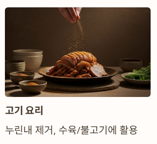 - 고기 요리(특히 돼지고기)의 누린내를 잡는 데도 효과적이에요. 수육이나 불고기 양념에 조금만 넣어보세요.