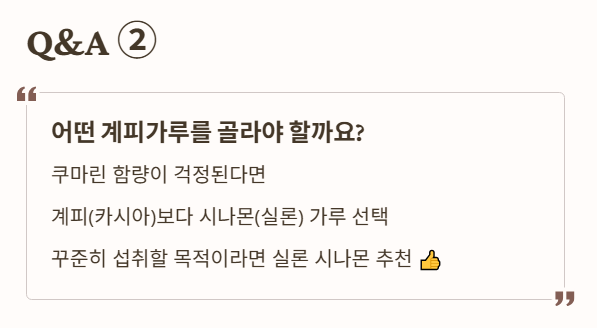 이 성분은 과다 섭취 시 간에 부담을 줄 수 있어, 꾸준히 드실 목적이라면 시나몬(실론)을 선택하는 것이 더 좋다고 해요. ✅