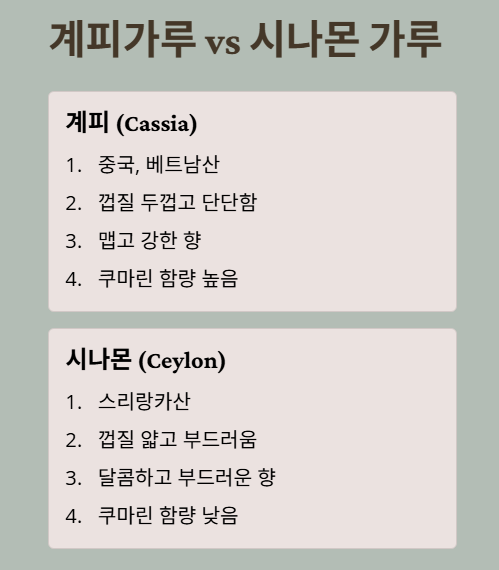 - 앞서 설명했듯, 쿠마린 함량이 걱정된다면 계피(카시아)보다는 시나몬(실론) 가루를 선택하는 것이 좋아요.