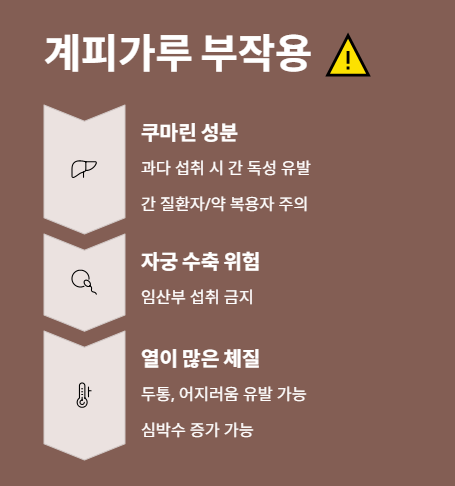 - 앞서 말했듯, 계피(카시아)에 많은 쿠마린은 과다 섭취 시 간 독성을 유발할 수 있어요.