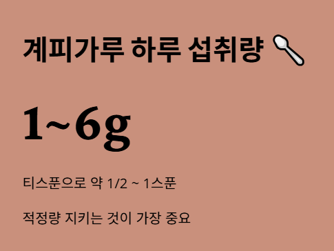 계피가루의 하루 권장 섭취량은 명확하게 정해져 있지는 않지만, 전문가들은 일반적으로 하루 1~6g 정도를 권장해요.