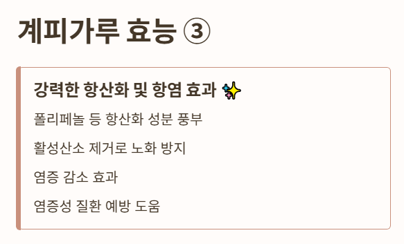 - 우리 몸의 활성산소를 제거해 노화를 방지하고, 염증을 줄여주어 각종 염증성 질환 예방에도 도움을 줄 수 있습니다.
