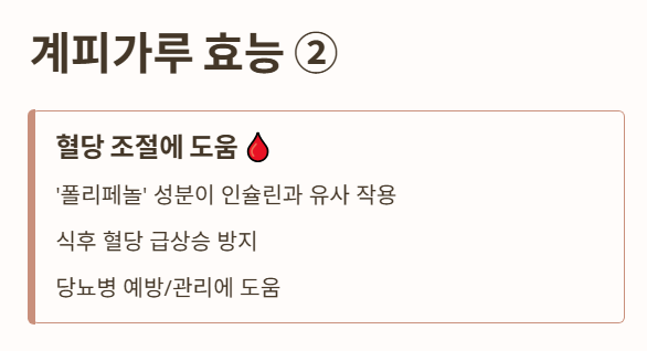 - 계피의 핵심 성분인 '폴리페놀'은 인슐린과 비슷한 작용을 해서 식후 혈당이 급격하게 오르는 것을 막아줘요.