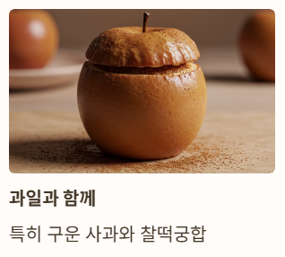- 사과나 바나나 같은 과일과도 찰떡궁합! 특히 구운 사과에 계피가루를 뿌리면 최고의 디저트가 된답니다. 🍎