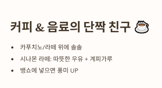 - 카푸치노나 라떼 위에 뿌리는 건 기본!