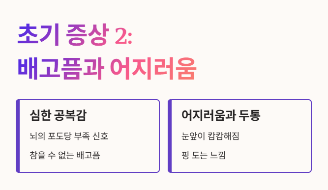 뇌에 포도당이 부족하다는 신호로, 갑자기 참을 수 없는 배고픔을 느끼게 됩니다. 😩