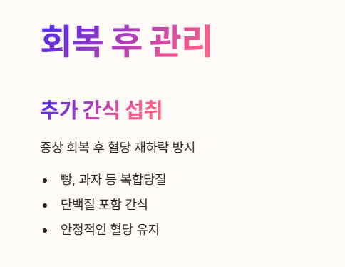 - 증상이 회복되면, 혈당이 다시 떨어지는 것을 막기 위해 빵, 과자 같은 복합당질과 단백질을 포함한 간식을 추가로 섭취해 주는 것이 좋아요.🥪