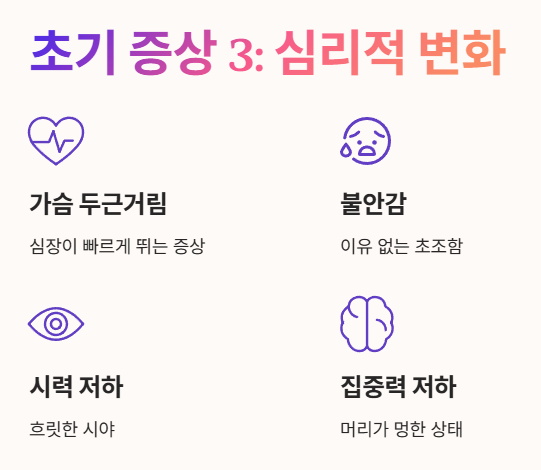 심장이 빠르게 뛰고, 이유 없이 불안하거나 초조한 느낌이 들기도 합니다.