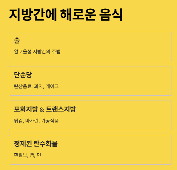 - 포화지방 & 트랜스지방: 튀김, 마가린, 가공식품 등은 염증을 유발하고 간 건강을 해쳐요.