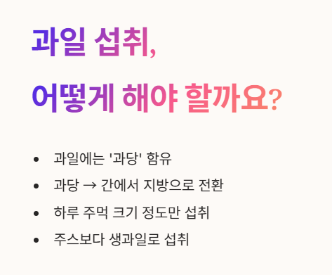 - 과일에는 비타민과 미네랄이 풍부하지만, '과당'도 많이 함유되어 있어요.