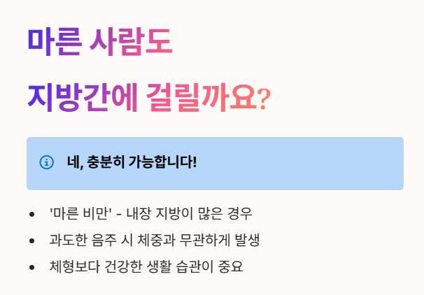 - 겉으로 보기에 말랐더라도 내장에 지방이 많은 '마른 비만'인 경우, 또는 술을 많이 마시는 경우에는 체중과 상관없이 지방간이 생길 수 있어요.