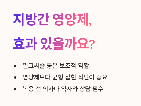 - 밀크씨슬과 같은 영양제가 간 건강에 도움을 줄 수 있다고 알려져 있지만, 이는 어디까지나 보조적인 역할이에요.