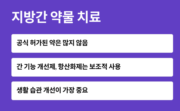- 일부 간 기능 개선제나 항산화제가 보조적으로 사용될 수 있지만, 가장 중요한 치료법은 생활 습관 개선(식단 조절, 운동, 체중 감량)입니다.