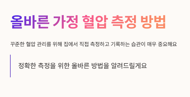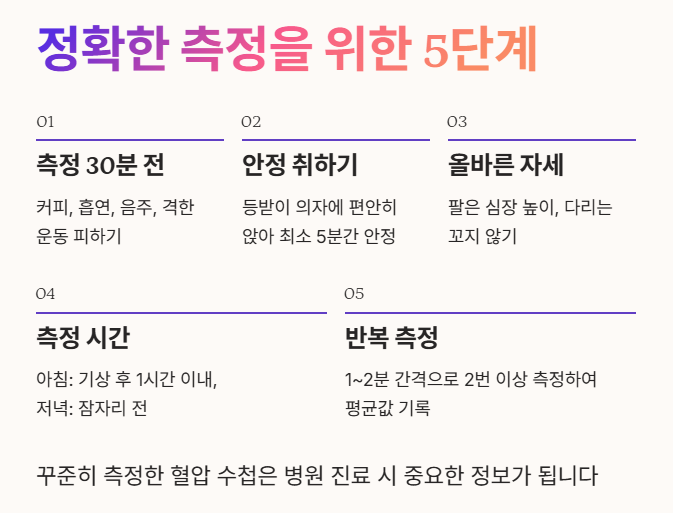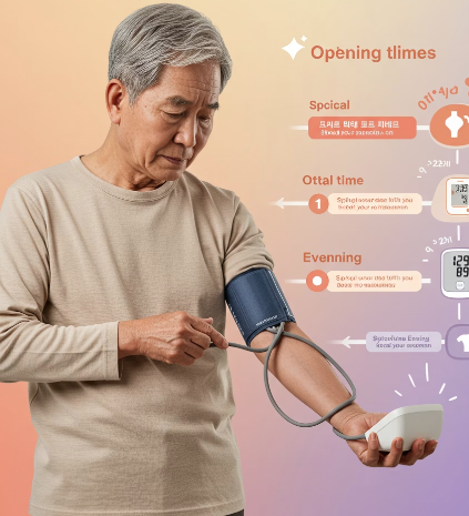 - 특히 아침에 재는 혈압(아침 고혈압)이 심뇌혈관 질환 예측에 중요하므로, 기상 후 1시간 이내에 측정하는 습관을 들이는 것을 추천합니다.