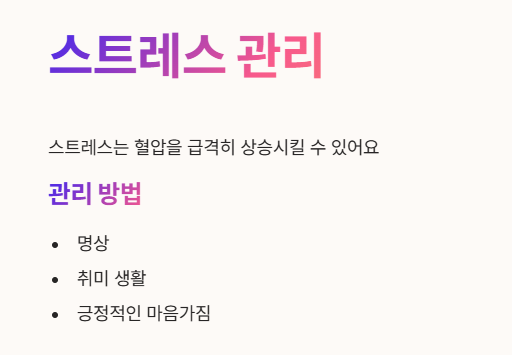 - 스트레스는 혈압을 급격히 상승시킬 수 있어요.