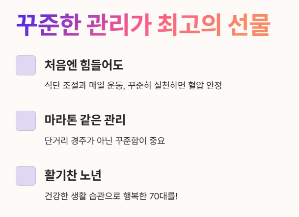 70대 혈압 관리는 단거리 경주가 아닌, 꾸준함이 중요한 마라톤 같아요. 🏃♂️