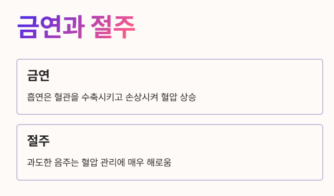 - 과도한 음주 역시 혈압 관리에 매우 해로우므로 반드시 줄여야 합니다.