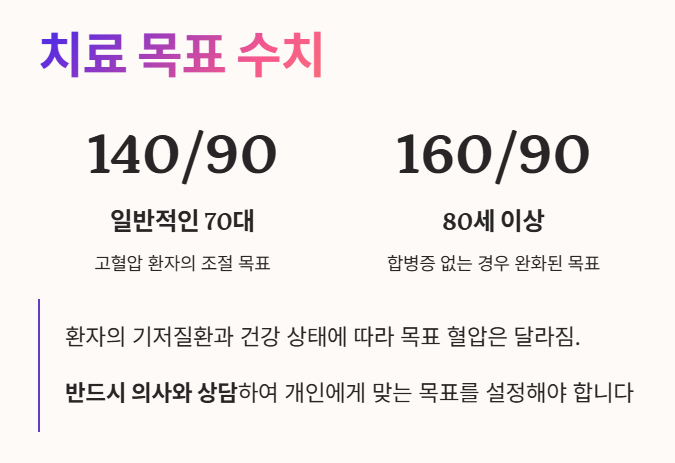 - 합병증이 없는 80세 이상 환자: 160/90 mmHg 미만으로 조절 목표를 완화하기도 합니다.