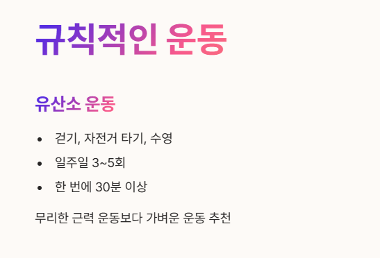 - 걷기, 자전거 타기, 수영 등 유산소 운동을 일주일에 3~5회, 한 번에 30분 이상 꾸준히 하는 것이 좋아요.