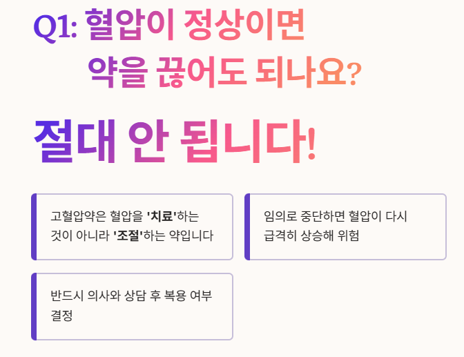 Q1: 약을 먹고 혈압이 정상으로 돌아오면 약을 끊어도 되나요?